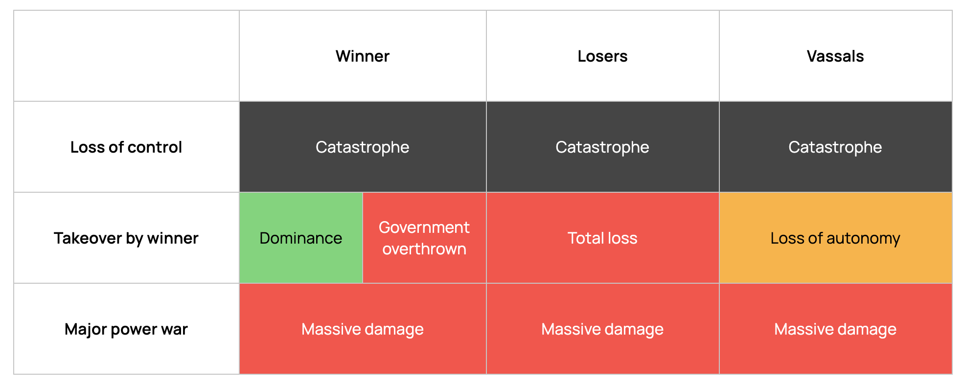 Desirability of outcomes by an actor’s role in an ASI race. “Winner” refers to the superpower that first achieves a decisive strategic advantage, regardless of whether this results in outcomes it considers favorable. “Losers” refers to any actors that are not aligned with the winner. “Vassals” refers to middle powers who are somewhat aligned with the winner.Middle powers may attempt to ally themselves with their favoured superpower (a strategy we referred to as “Vassal’s Wager”). However, this strategy relies on multiple contingencies aligning favorably, with the middle power in question having little control over them: the chosen superpower must win the race, avert catastrophic risks, and subsequently respect the middle power’s sovereignty despite having overwhelming power to do otherwise.